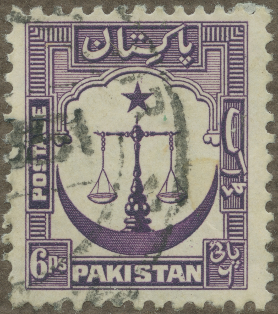 Frimärke ur Gösta Bodmans filatelistiska motivsamling, påbörjad 1950. Frimärke från Pakistan, 1948. Motiv av Vågskål