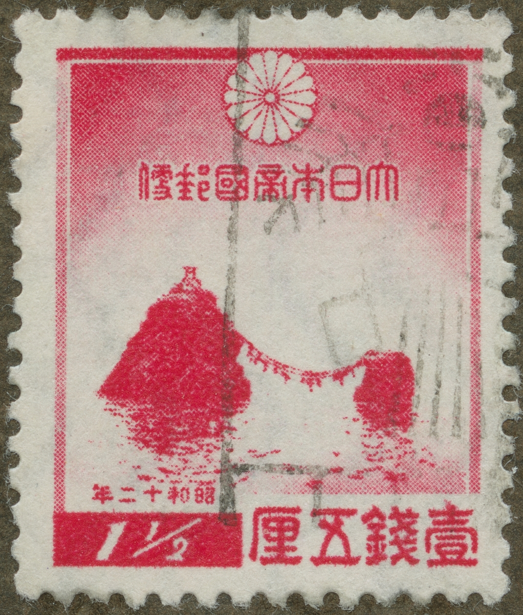 Frimärke ur Gösta Bodmans filatelistiska motivsamling, påbörjad 1950. Frimärke från Japan, 1936. Motiv av Klipporna "Fuotanigacura" Japan "-Frimärke för nyårskort-"