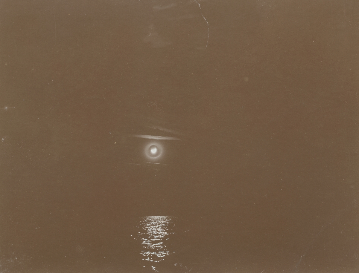 Fotografi från expedition till Grönland. Landskapsbild med måne vars ljus avspeglar sig i havet.