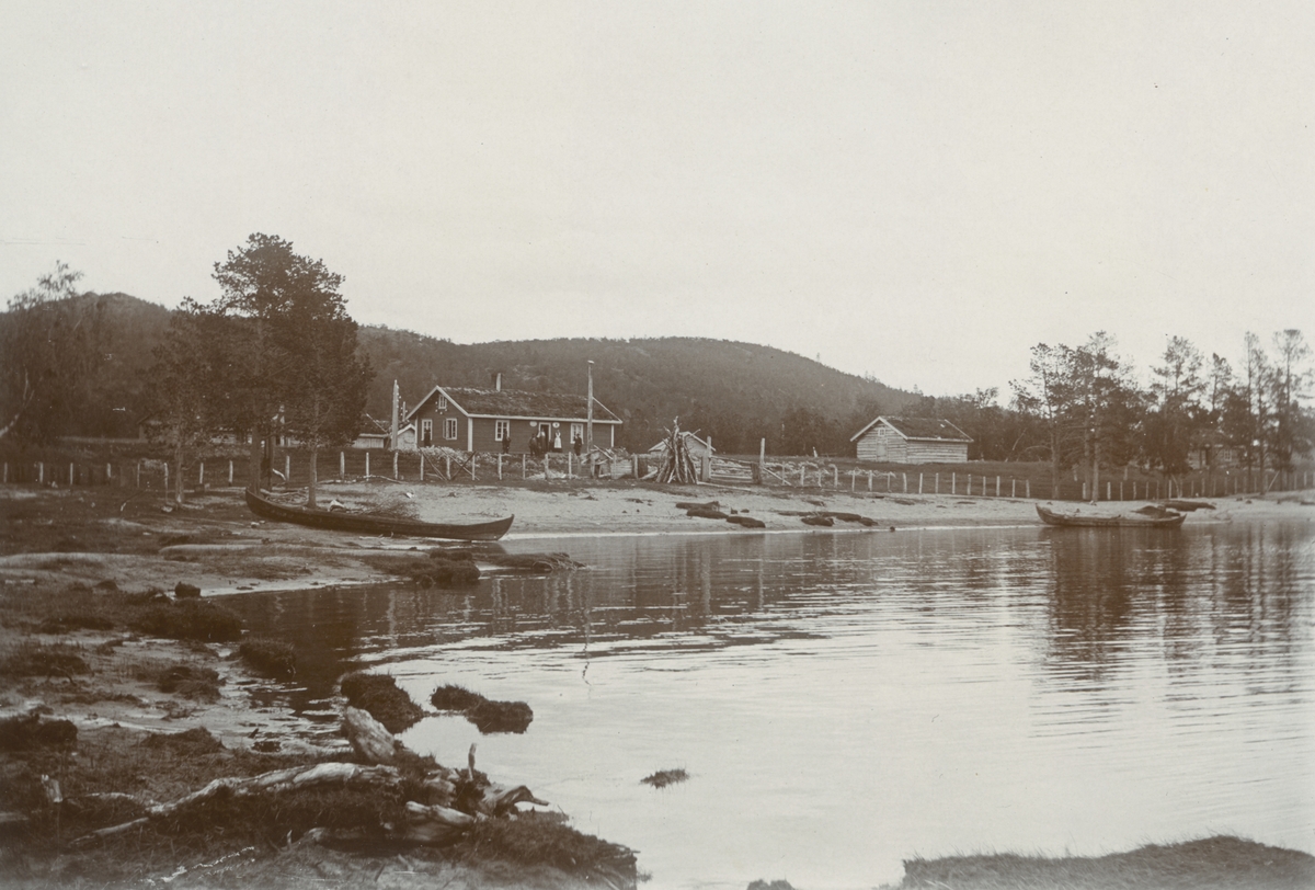 Fotografi från expedition till Grönland. Motiv av liten fiskeby belägen vid havsstranden. På stranden syns två mindre träbåtar.
