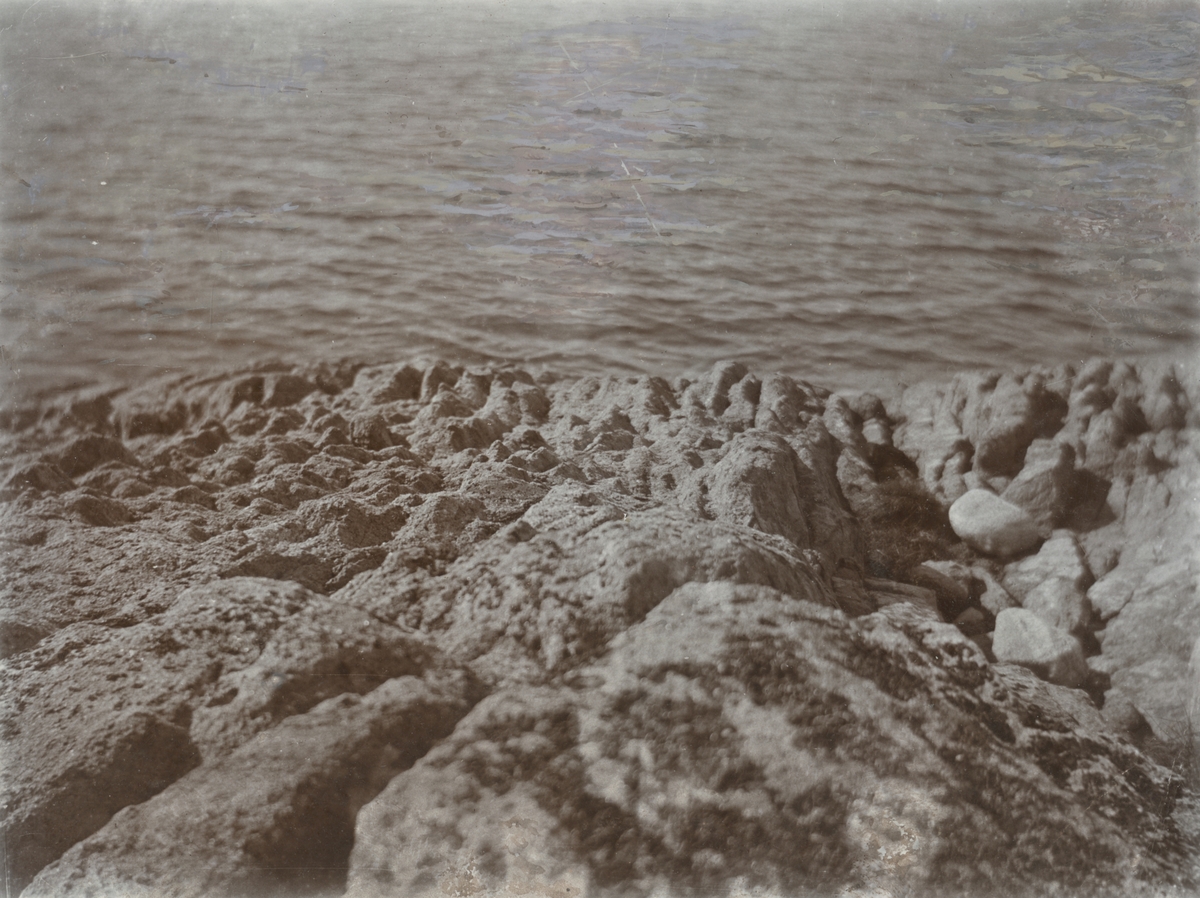 Fotografi från expedition till Grönland. Motiv av stenig strand och hav. Bilden kan vara tagen i Holstenborg/Sisimuit.