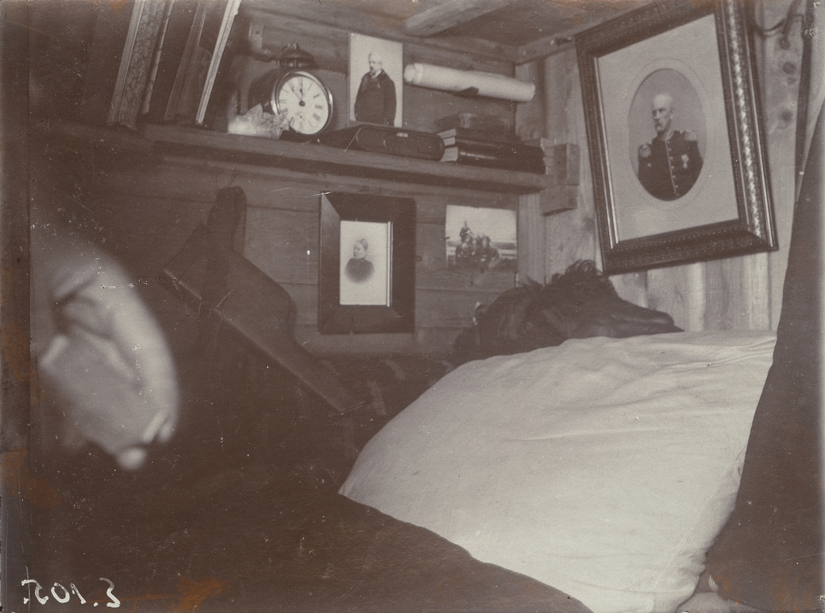 Fotografi från första svenska Antarktisexpeditionen 1901-1904. Interiörbild från sovplats i ett litet trähus. På väggarna hänger tavlor och på en hylla står böcker och en väckarklocka.
