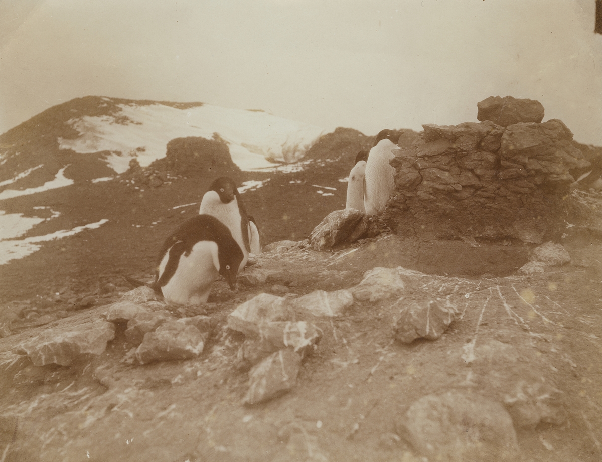 Fotografi från första svenska Antarktisexpeditionen 1901-1904. Motiv av fyra pingviner på klippa nedanför berg.