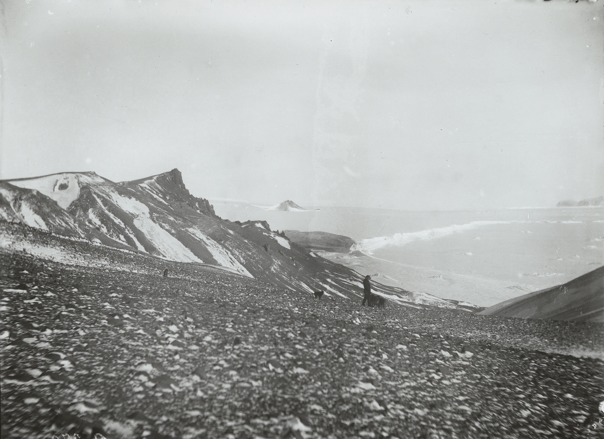 Fotografi från första svenska Antarktisexpeditionen 1901-1904. Motiv av man på promenad med hundar i ett snöigt bergslandskap.