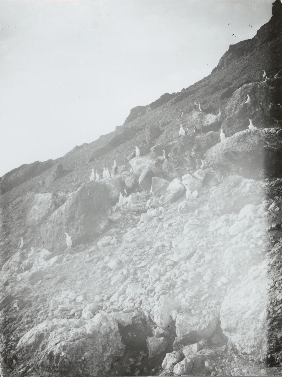 Fotografi från första svenska Antarktisexpeditionen 1901-1904. Motiv av pingvinkoloni på bergssluttning.