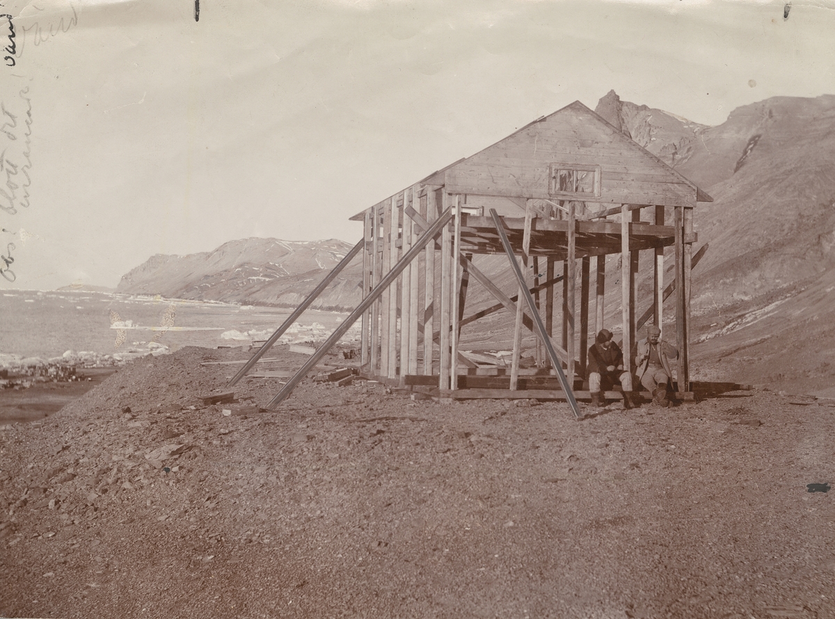 Fotografi från första svenska Antarktisexpeditionen 1901-1904. Motiv av två män som bygger huset i Snow Hill.