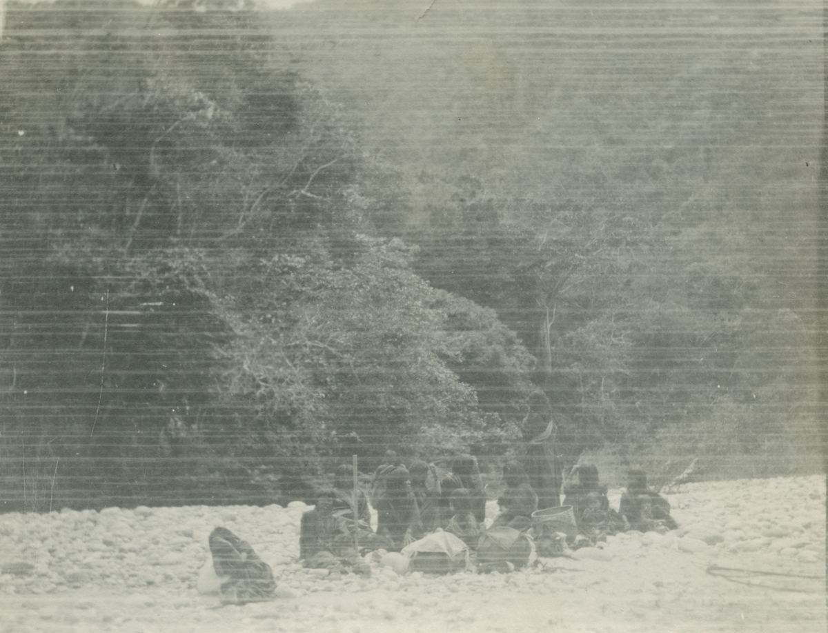 Fotografi från expedition till Peru 1920. Motiv av en grupp människor som sitter på stenig mark framför en tätbevuxen skog.
