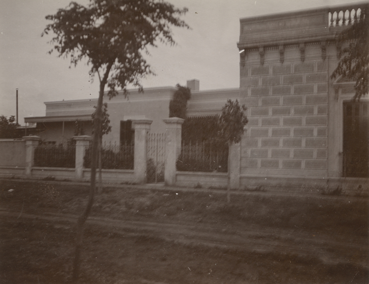 Fotografi från expedition till Peru 1920. Motiv av stenhus med trädgård.
