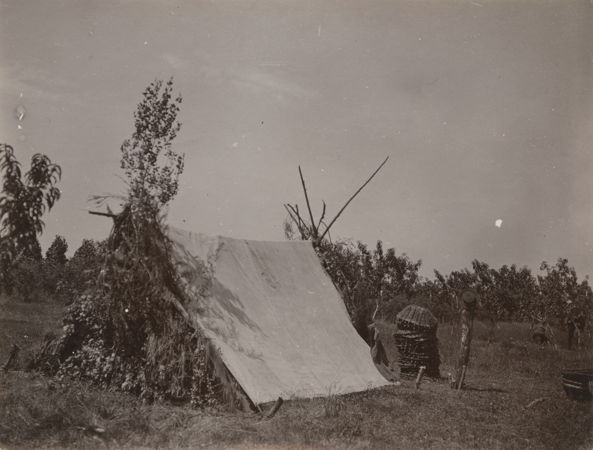 Fotografi från expedition till Peru 1920. Motiv av vitt tält som är delvis kamouflerat med hjälp av trädgrenar.