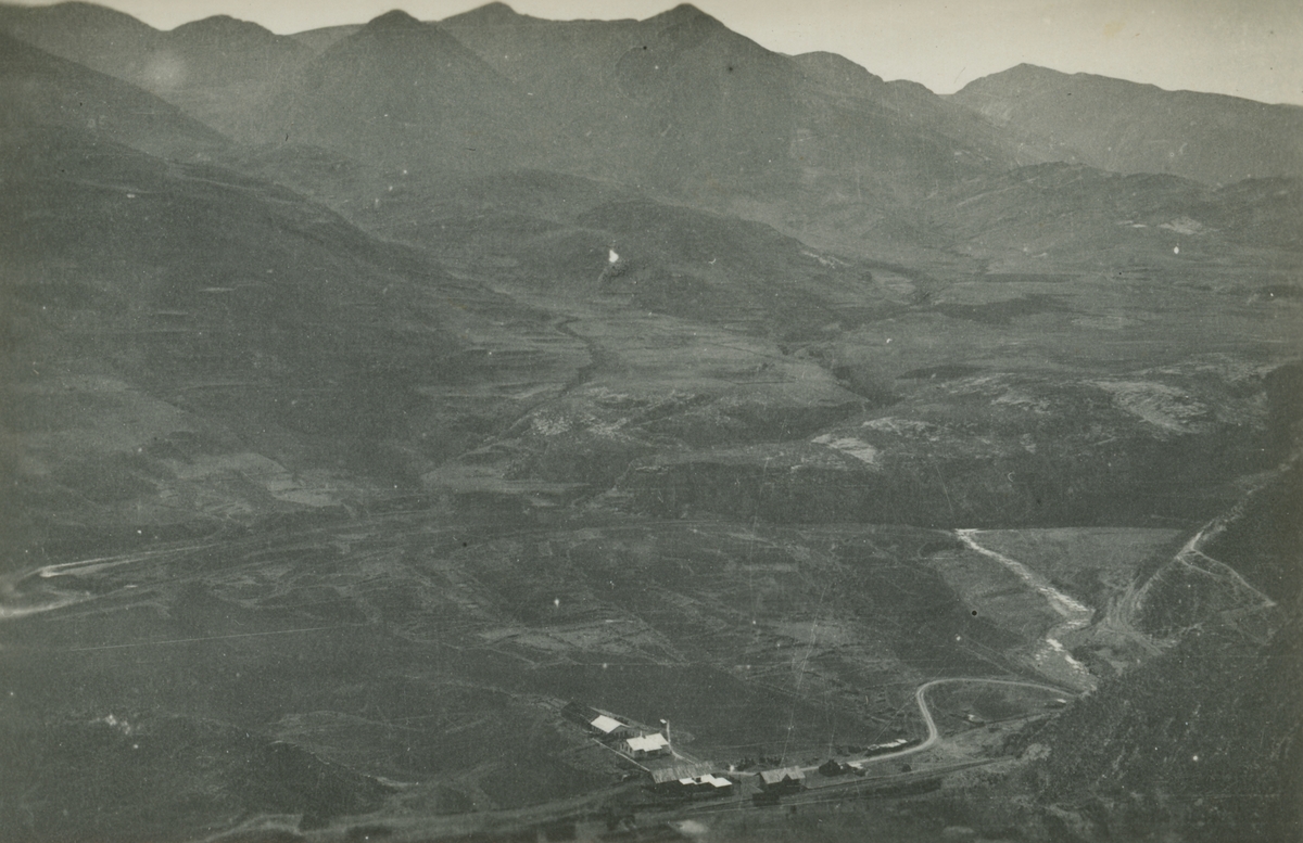 Fotografi från expedition till Peru 1920. Vy över bergslandskap. I förgrunden syns en väg och några hus.