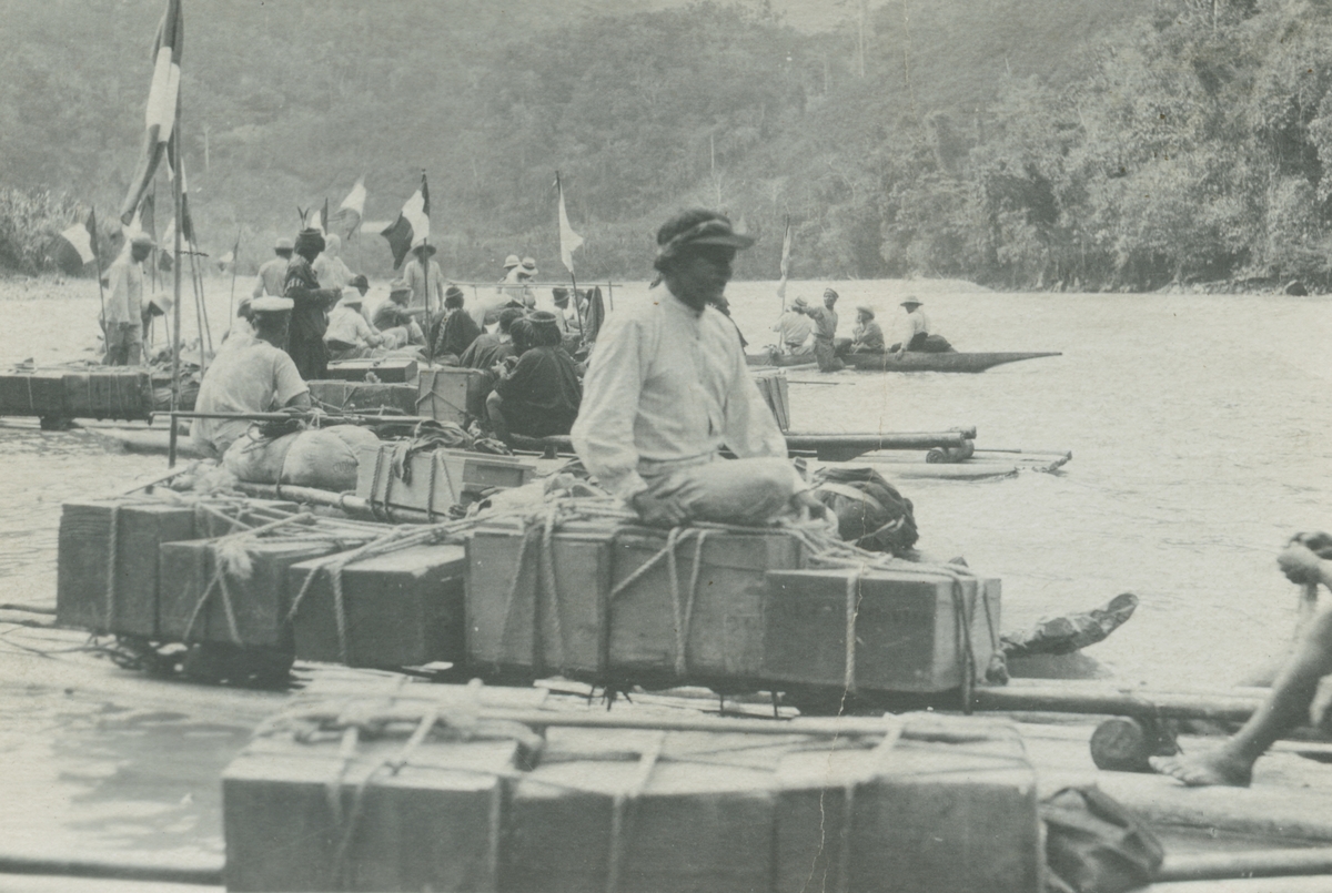 Fotografi från expedition till Peru 1920. Motiv av ett stort antal expeditionsdeltagare ombord på fullastade flottar i stor flod i djungeln.