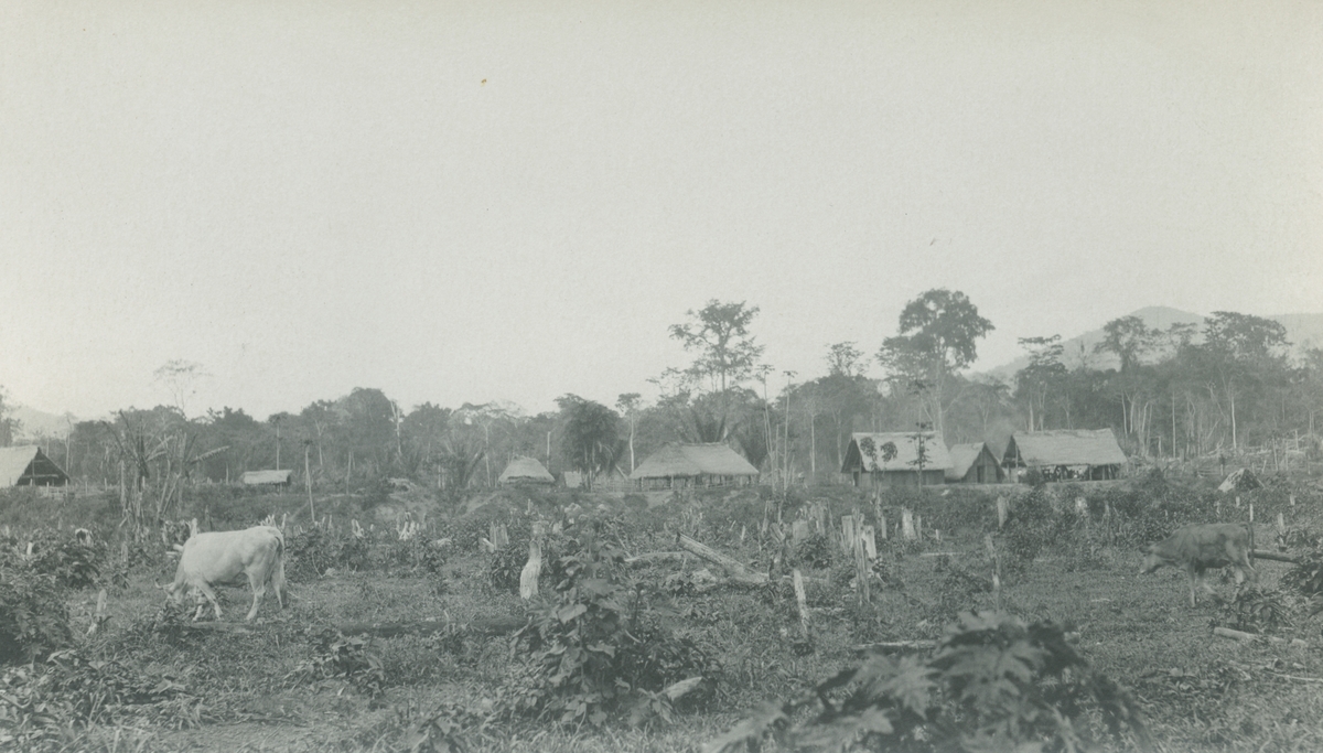 Fotografi från expedition till Peru 1920. Motiv av liten by i djungeln.