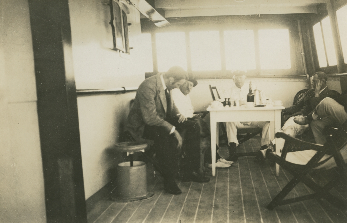 Fotografi från expedition till Peru 1920. Motiv av expeditionsdeltagare som sitter ner och umgås runt ett bord. Bilden ser ut att vara tagen inne i ett fartyg.
