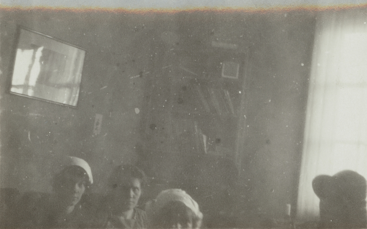 Fotografi från expedition till Spetsbergen. Motiv av fyra kvinnor som sitter inomhus framför en tavla och bokhylla.