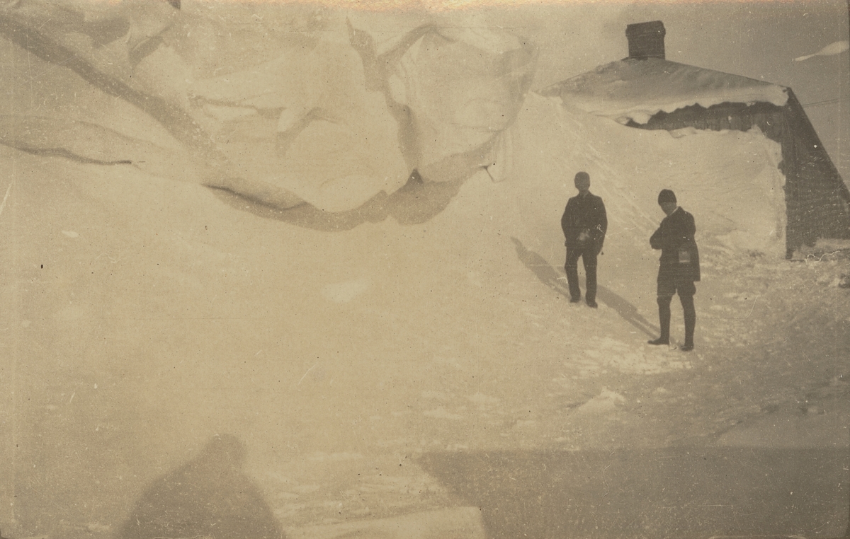 Fotografi från expedition till Spetsbergen. Motiv av två män som står bredvid ett litet is- och snöberg.