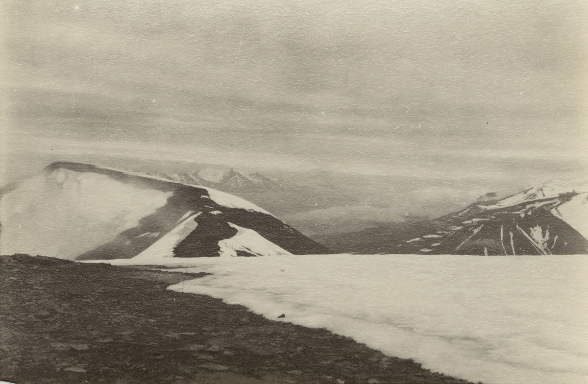 Fotografi från expedition till Spetsbergen. Vy över snötäckt bergslandskap.