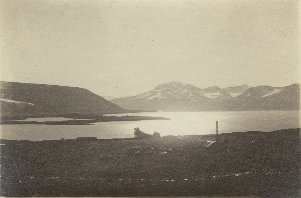 Fotografi från expedition till Spetsbergen. Vy över Sveagruvans strand, havet och snötäckta berg.