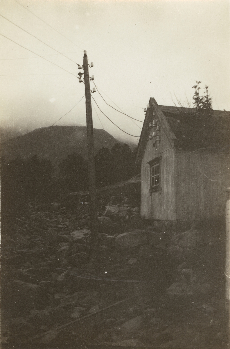 Fotografi från expedition till Spetsbergen. Motiv av hus och telefonstolpe nedanför ett berg.