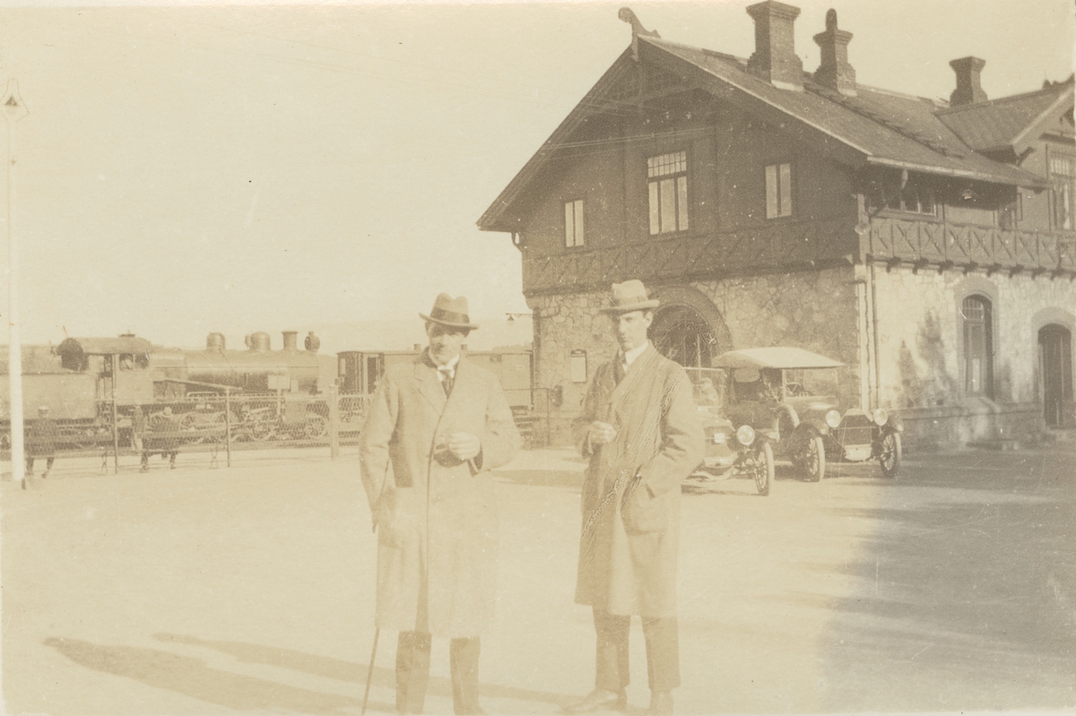 Fotografi från expedition till Spetsbergen. Motiv av två män i hatt och rock som poserar framför ett hus. I bakgrunden syns en bil och ett tåg.