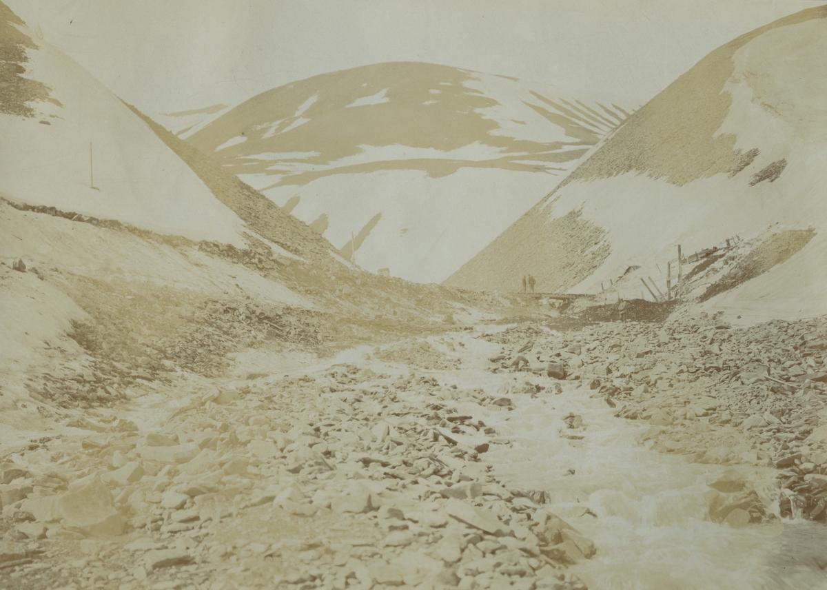 Fotografi från expedition till Spetsbergen. Vy över islandskap och snötäckta berg.