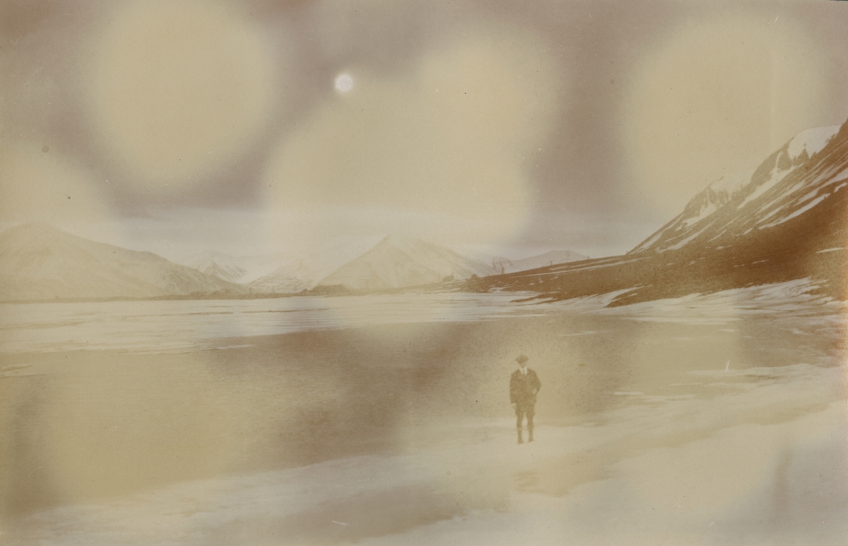 Fotografi från expedition till Spetsbergen. Motiv av man klädd i kavaj och slips som står mitt i ett istäckt bergslandskap.