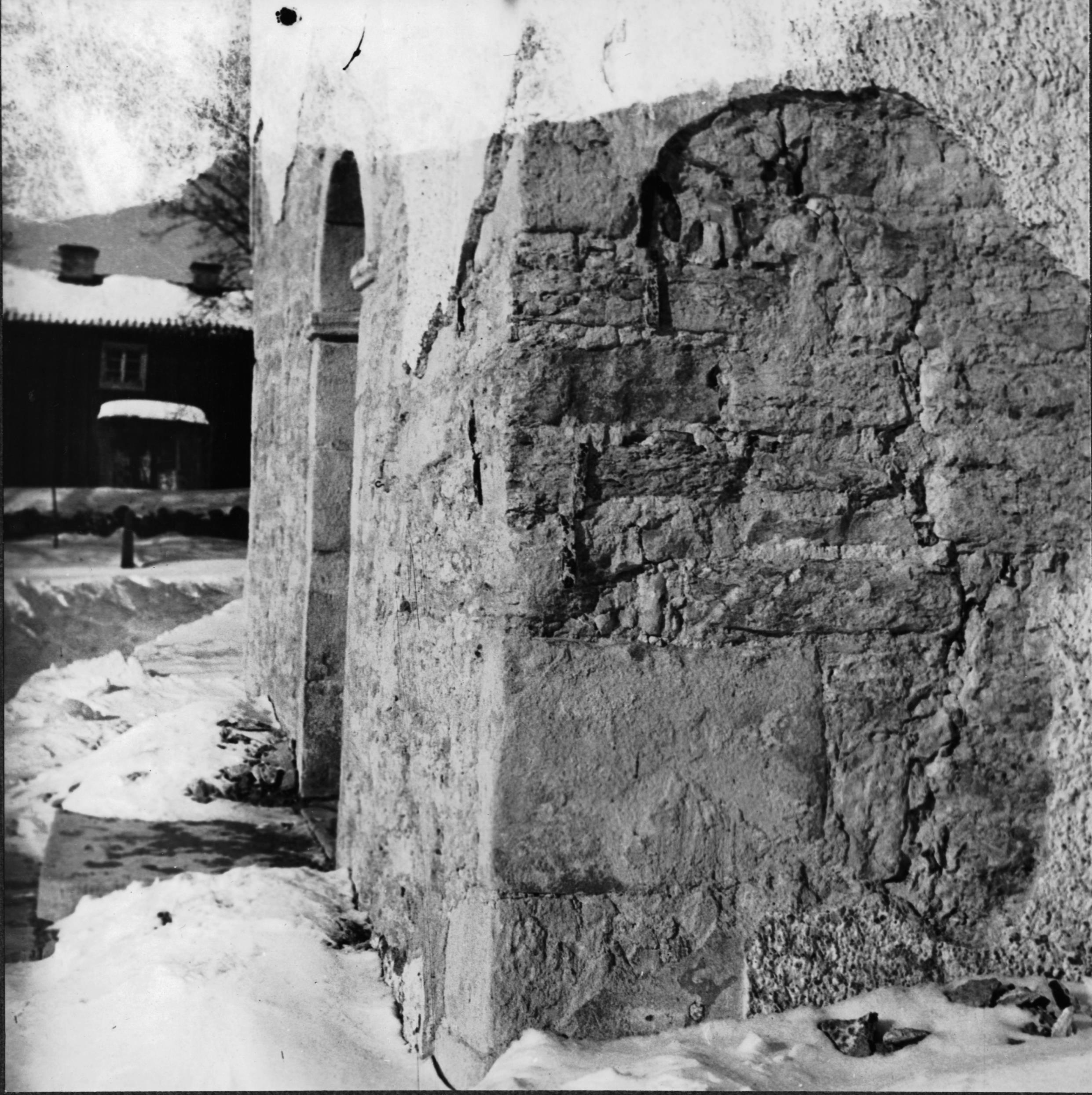 Tornets sydvästra hörn med avknackad puts.