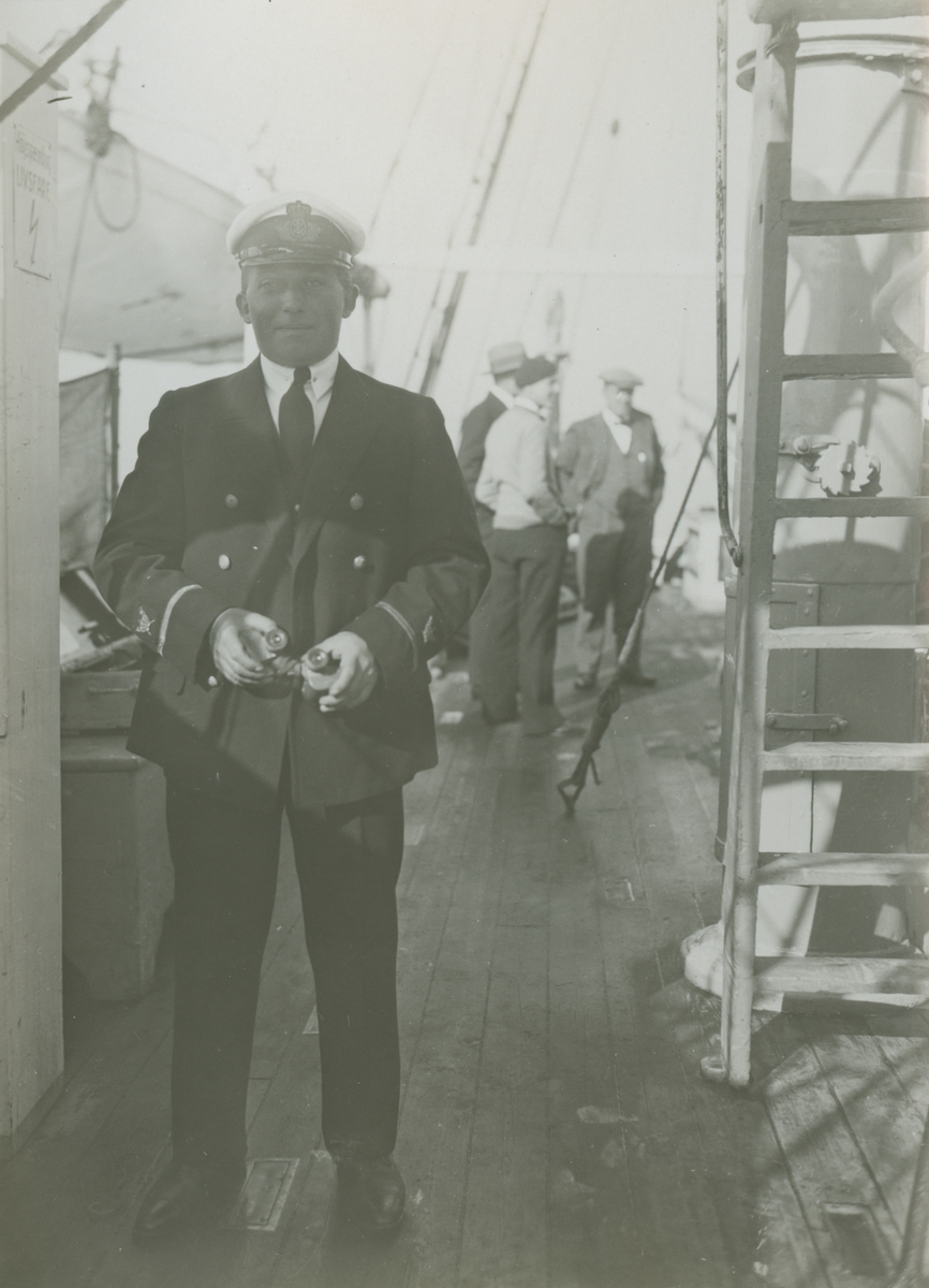 Fotografi från expedition till Östgrönland 1929. Dansk-svensk expedition under ledning av Lauge Koch. Svenska deltagare: Oscar Kulling och Helge Backlund. Motiv av fartygskapten och expeditionsdeltagare.
