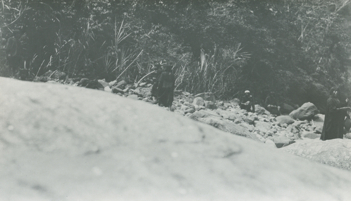 Fotografi från expedition till Peru 1920. Motiv av människor på stenig strand i djungeln.