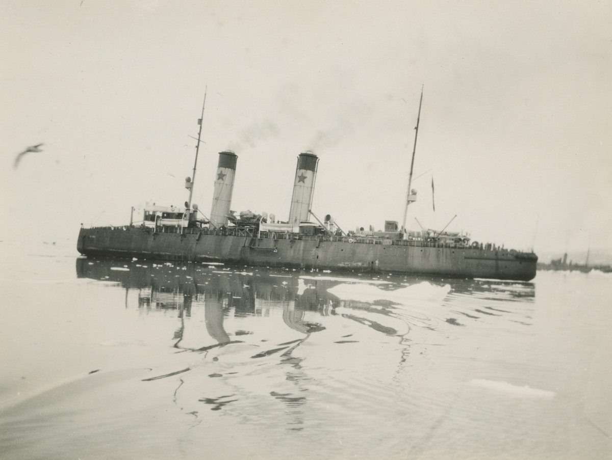 Fotografi från svenska undsättningsexpeditionen 1928. Motiv av den ryska isbrytaren Krasin vid King's Bay.