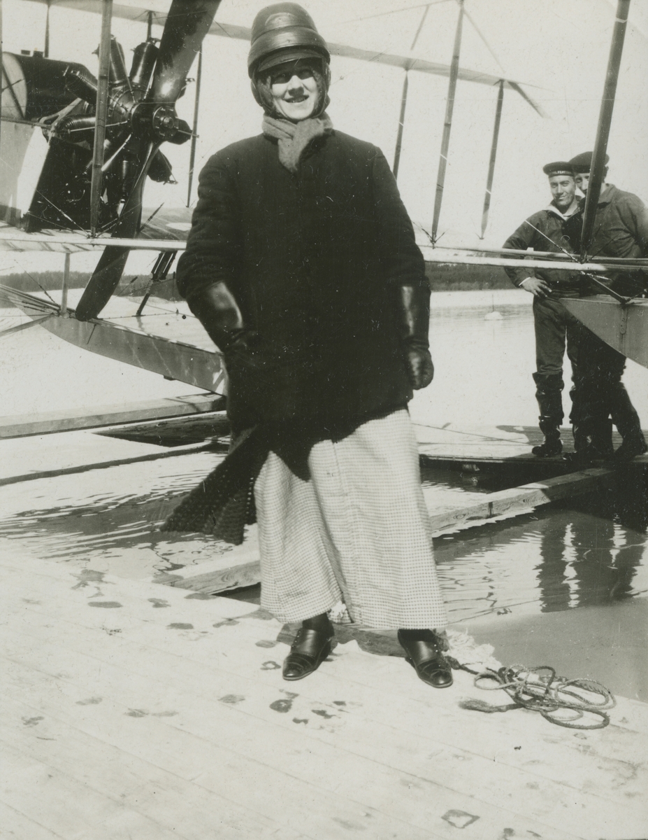 Diverse bilder från Fred Goldbergs samling. Motiv av kvinna som poserar på brygga framför flygbåt.