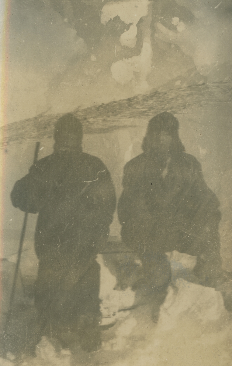 Fotografi från expedition till Spetsbergen. Motiv av två expeditionsdeltagare som sitter på ett snöblock i ett snö- och islandskap..