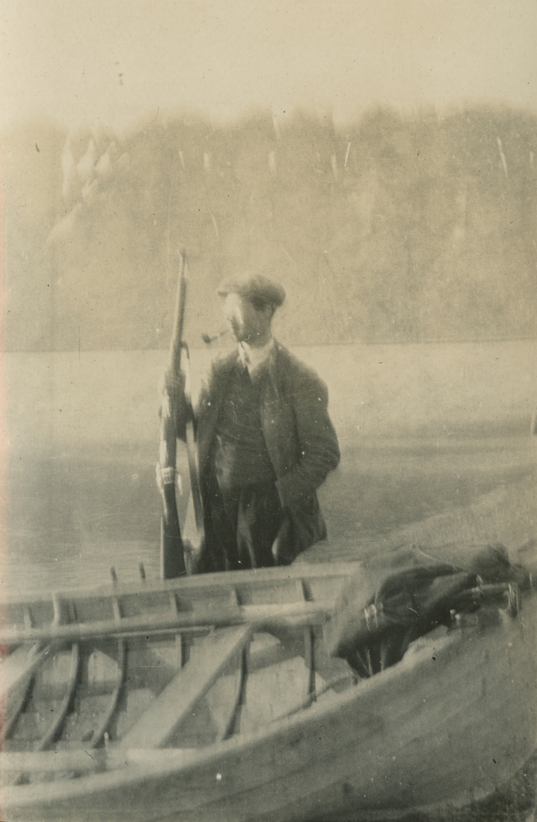 Fotografi från expedition till Spetsbergen. Motiv av man med keps och pipa som poserar med gevär framför liten träbåt.