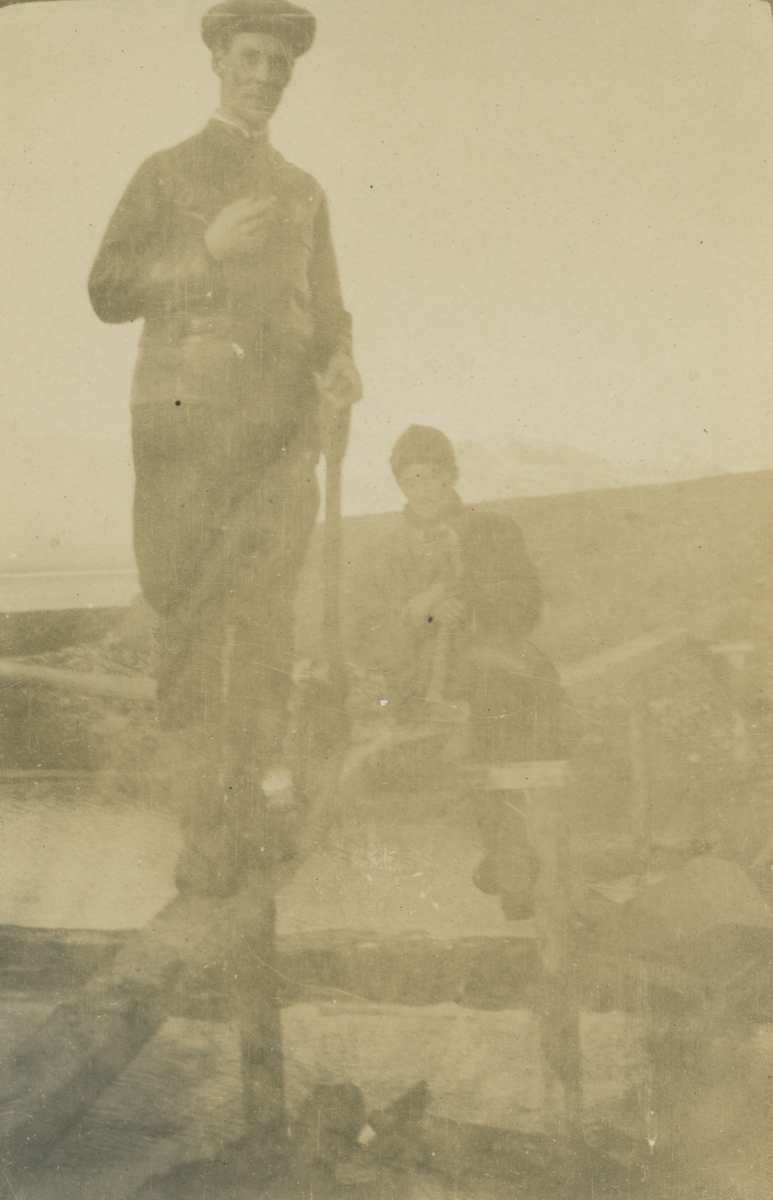 Fotografi från expedition till Spetsbergen. Motiv av två expeditionsdeltagare som står och sitter på ett träräcke.
