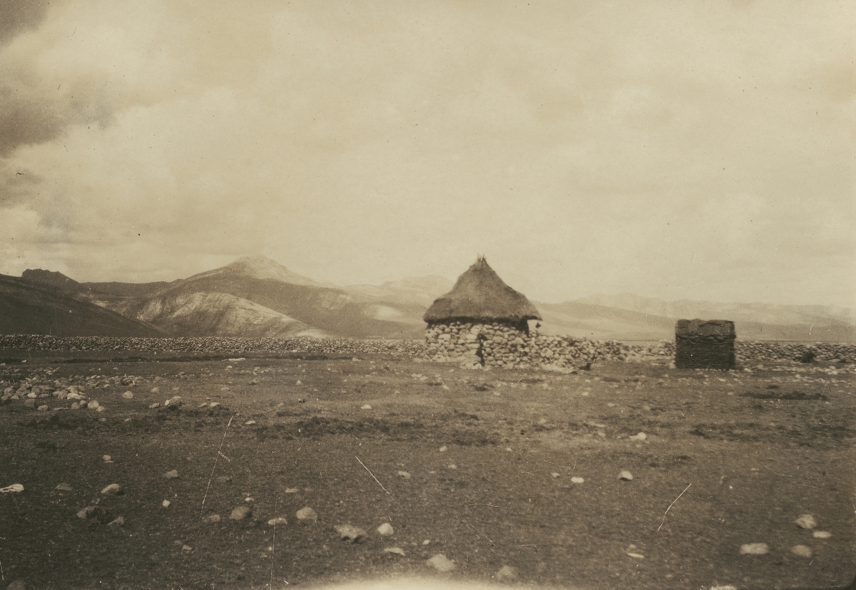 Fotografi från kuvert märkt med "Ernst Nordenskjöld". Motiv av stenhydda med halmtak i ett bergslandskap.