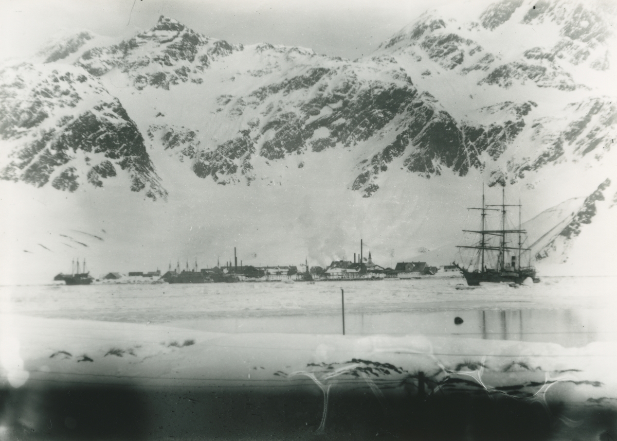 Bild från expedition i Antarktisområdet. Motiv av hamn och snötäckta berg.