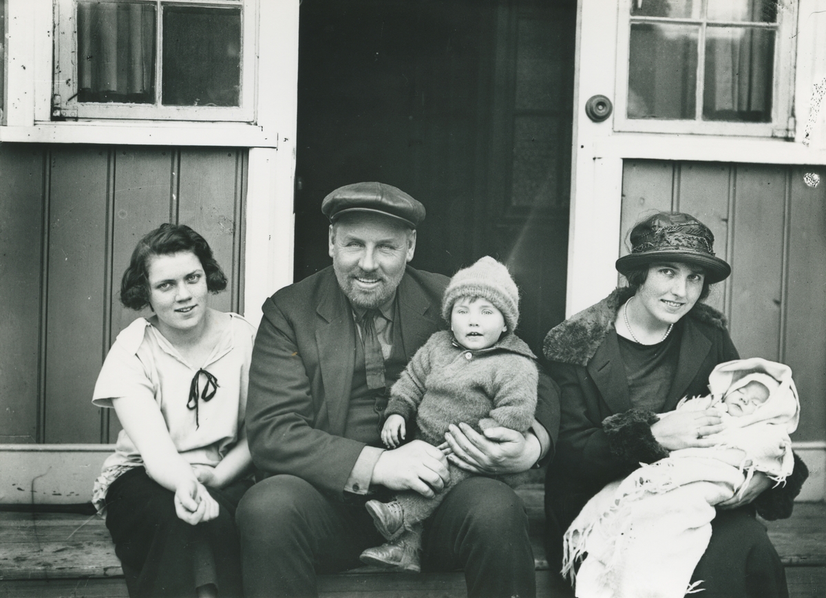 Bild från expedition i Antarktisområdet. Motiv av man och kvinna tillsammans med tre barn framför hus. Kvinnan till höger är fru Binnie.