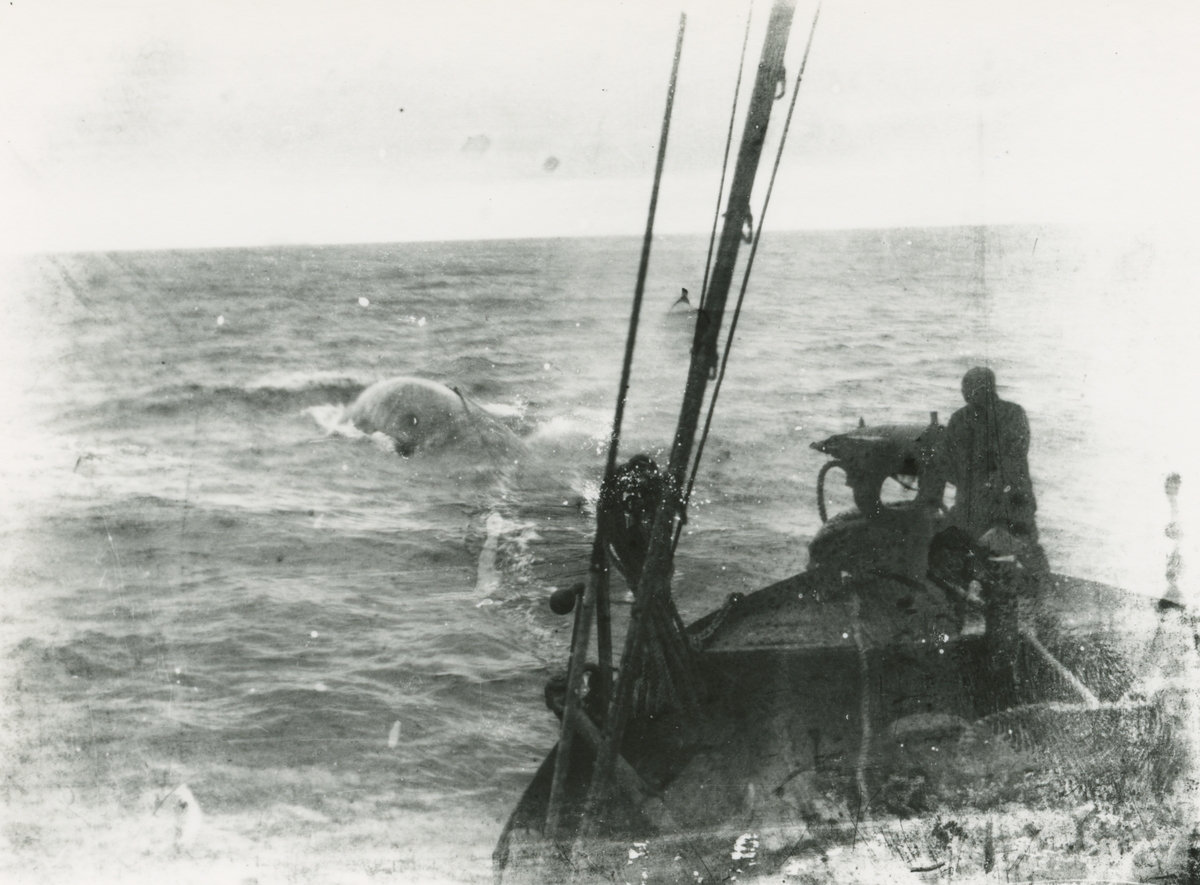 Bild från expedition i Antarktisområdet. Motiv av valfångare som harpunerar en val.
