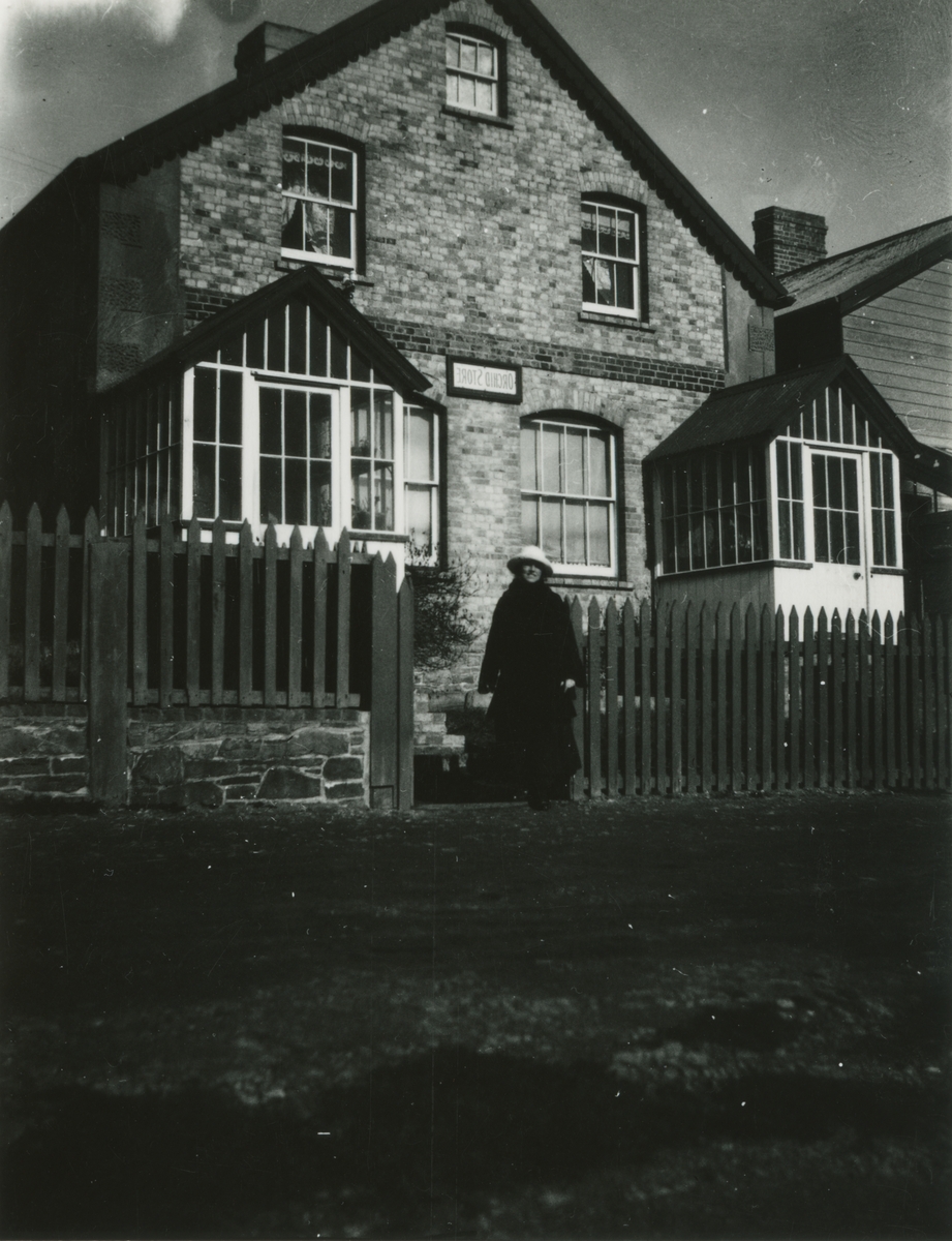 Bild från expedition i Antarktisområdet. Motiv av kvinna framför stort stenhus.
