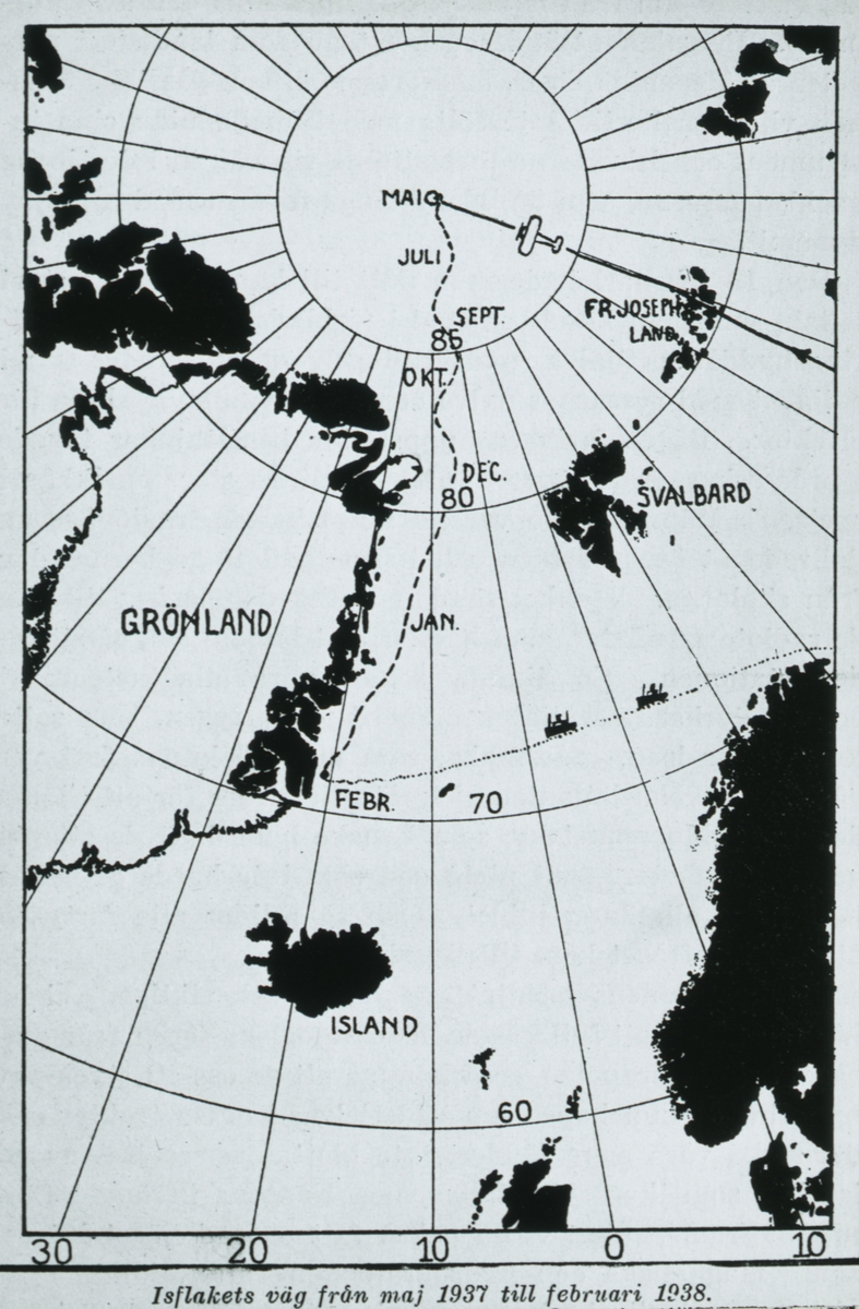 Glasnegativ med motiv av illustration över ett isflaks resa genom Arktis-området. Datering: maj 1937 till februari 1938.