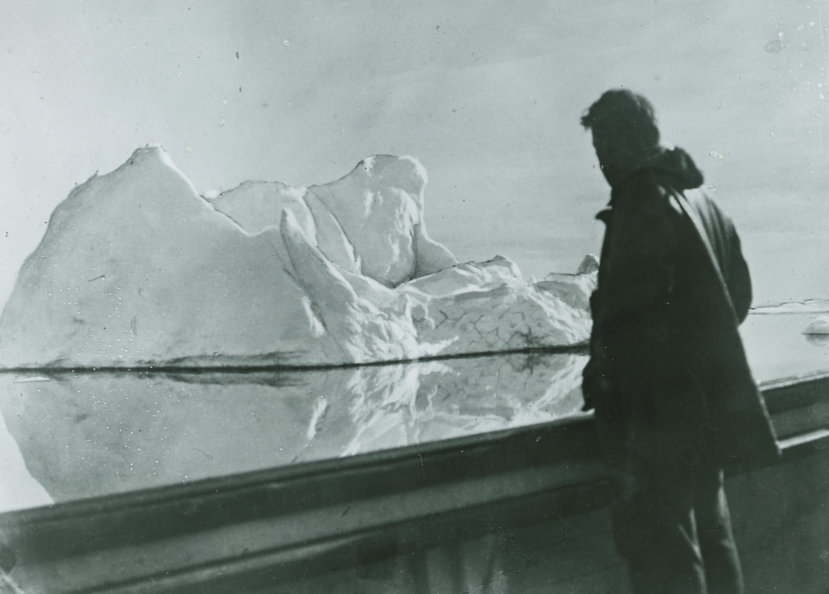 Glasnegativ med motiv av en man som betraktar ett isberg.
