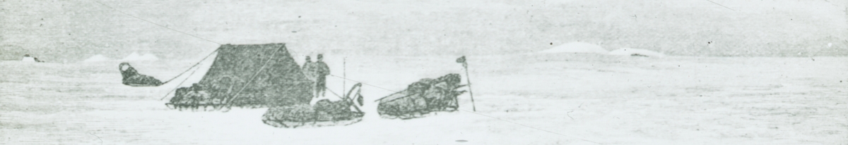 Fotografi från Grönland. Teckning med motiv av män med tält och slädar i ett snölandskap.