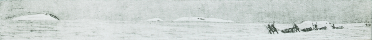 Fotografi från Grönland. Teckning med motiv av män som drar slädar i ett snölandskap.