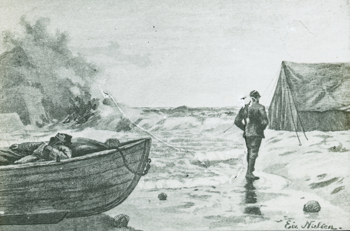 Fotografi från Grönland. Teckning med motiv av skadad man i båt.