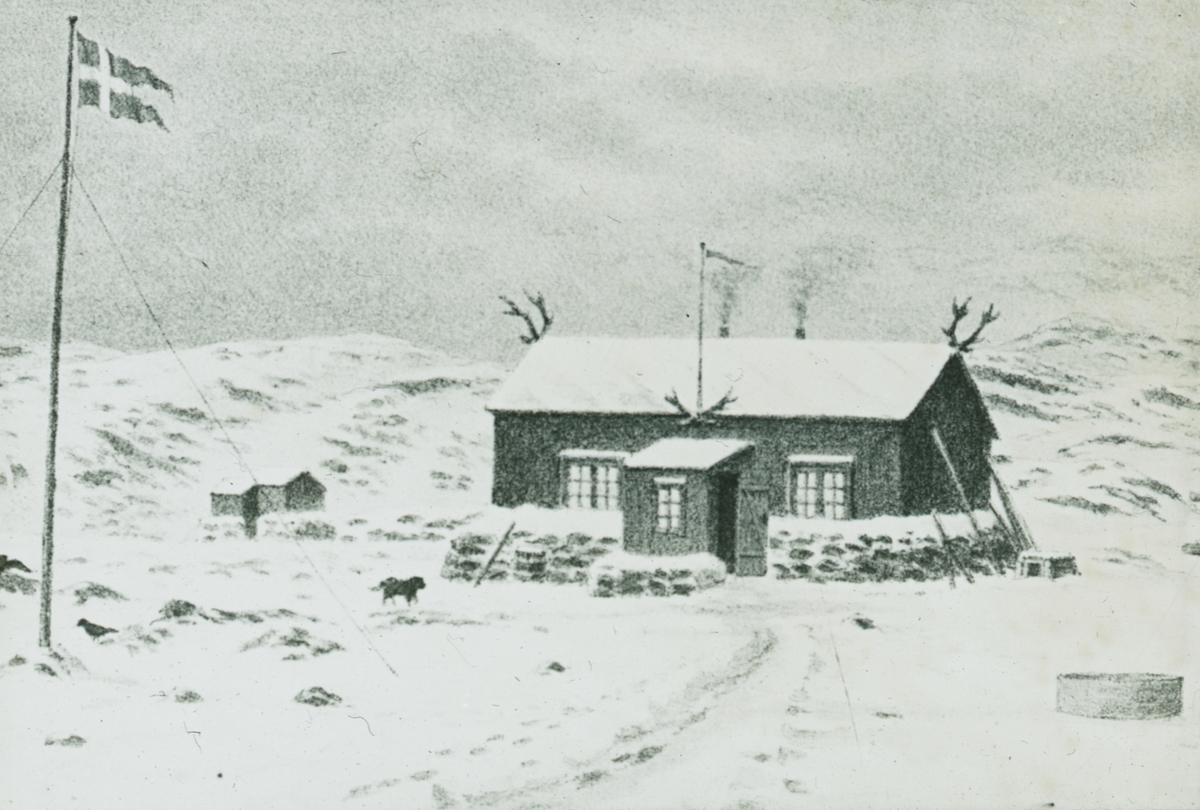 Fotografi från Grönland. Teckning med motiv av hus i snölandskap.
