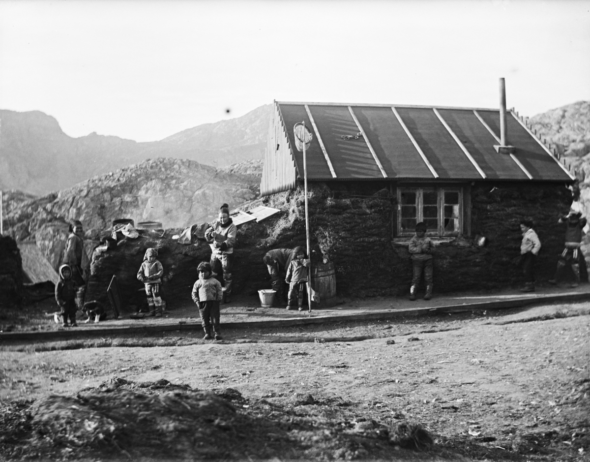 Fotografi från Grönland. Motiv av kvinnor och barn utanför hus beläget nedanför berg.