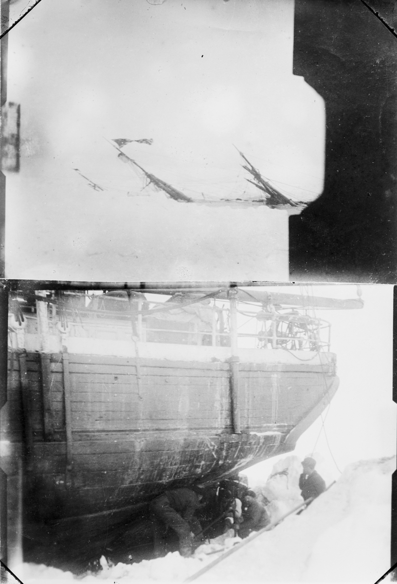 Fotografi från undsättningsexpeditionen med fartyget Uruguay 1903. Motiv av fartyg som verkar ha fastnat i isen.