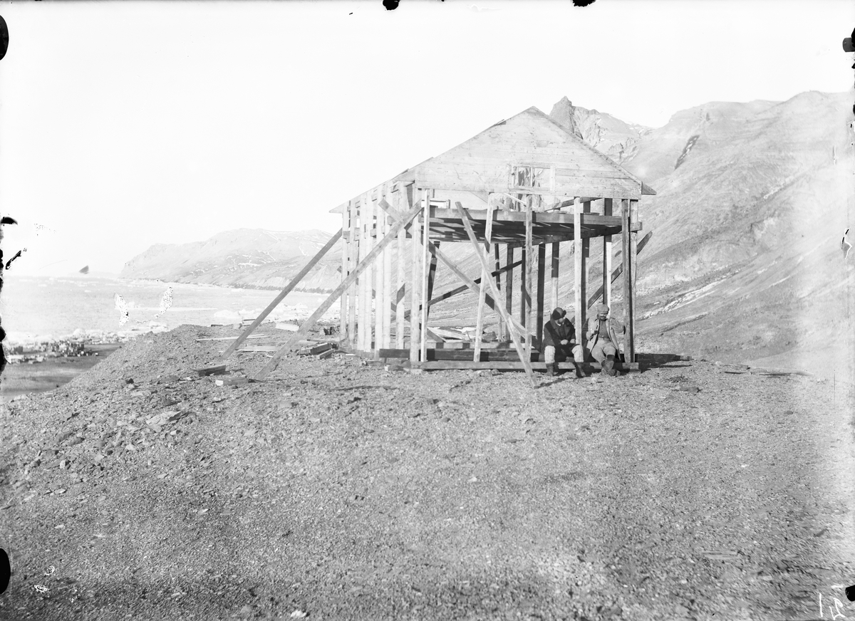 Fotografi från undsättningsexpeditionen med fartyget Uruguay 1903. Motiv av två män som bygger ett hus nedanför berg.