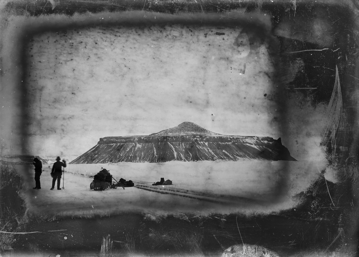 Fotografi från undsättningsexpeditionen med fartyget Uruguay 1903. Motiv av två män med packning i snön.