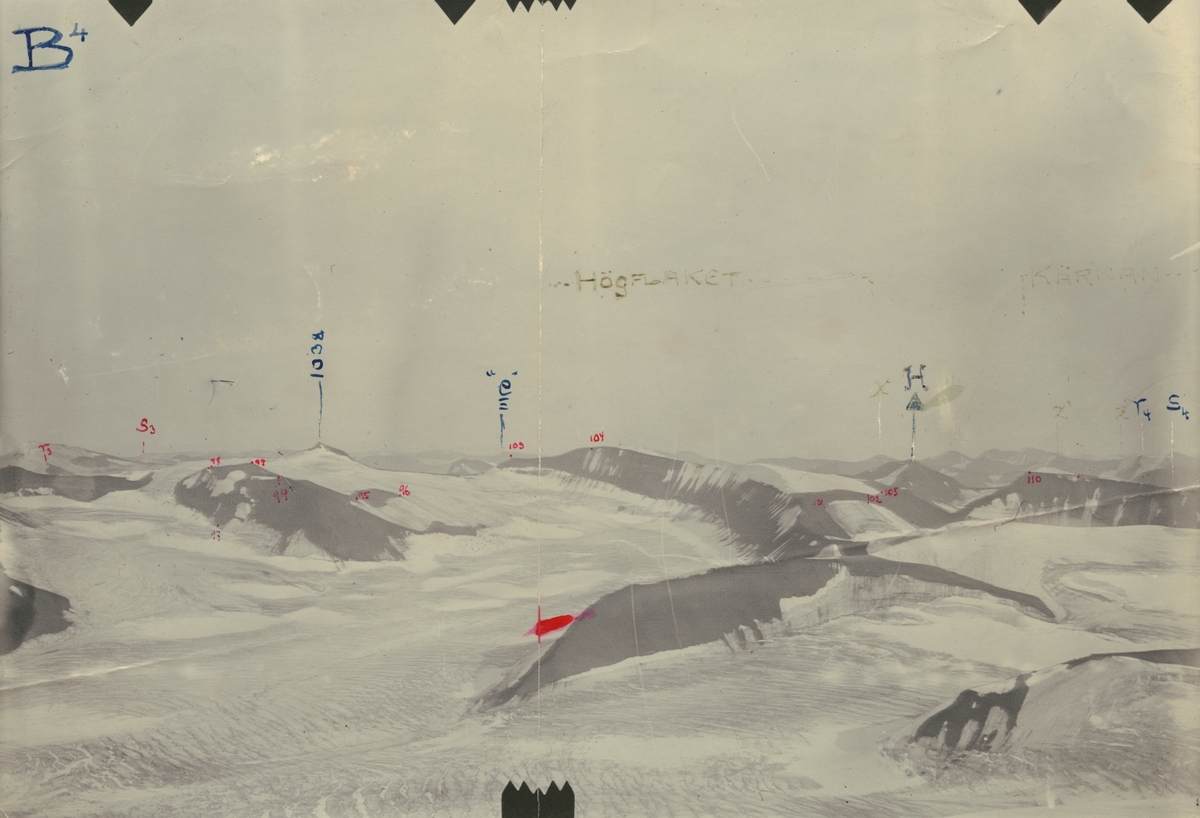Fotografi från expedition till Spetsbergen 1920. Vy över istäckt bergslandskap.
