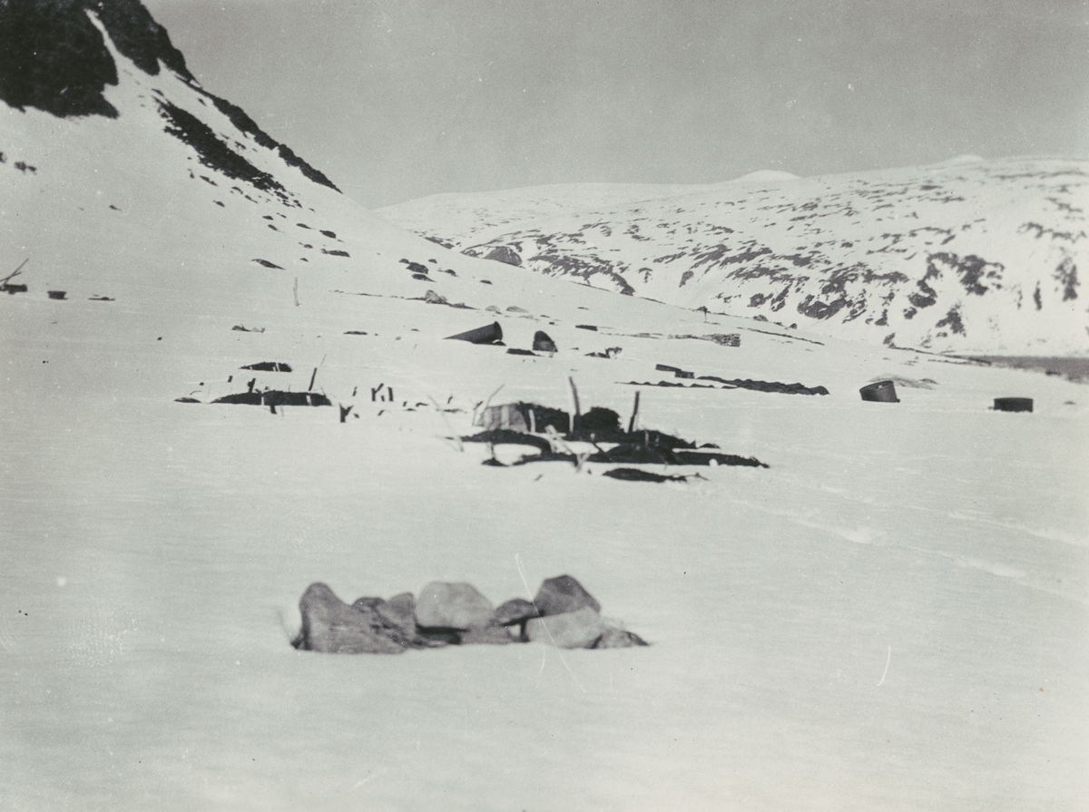 Fotografi från svenska undsättningsexpeditionen 1928. Motiv av resterna av Andrées läger i Virgohamna.